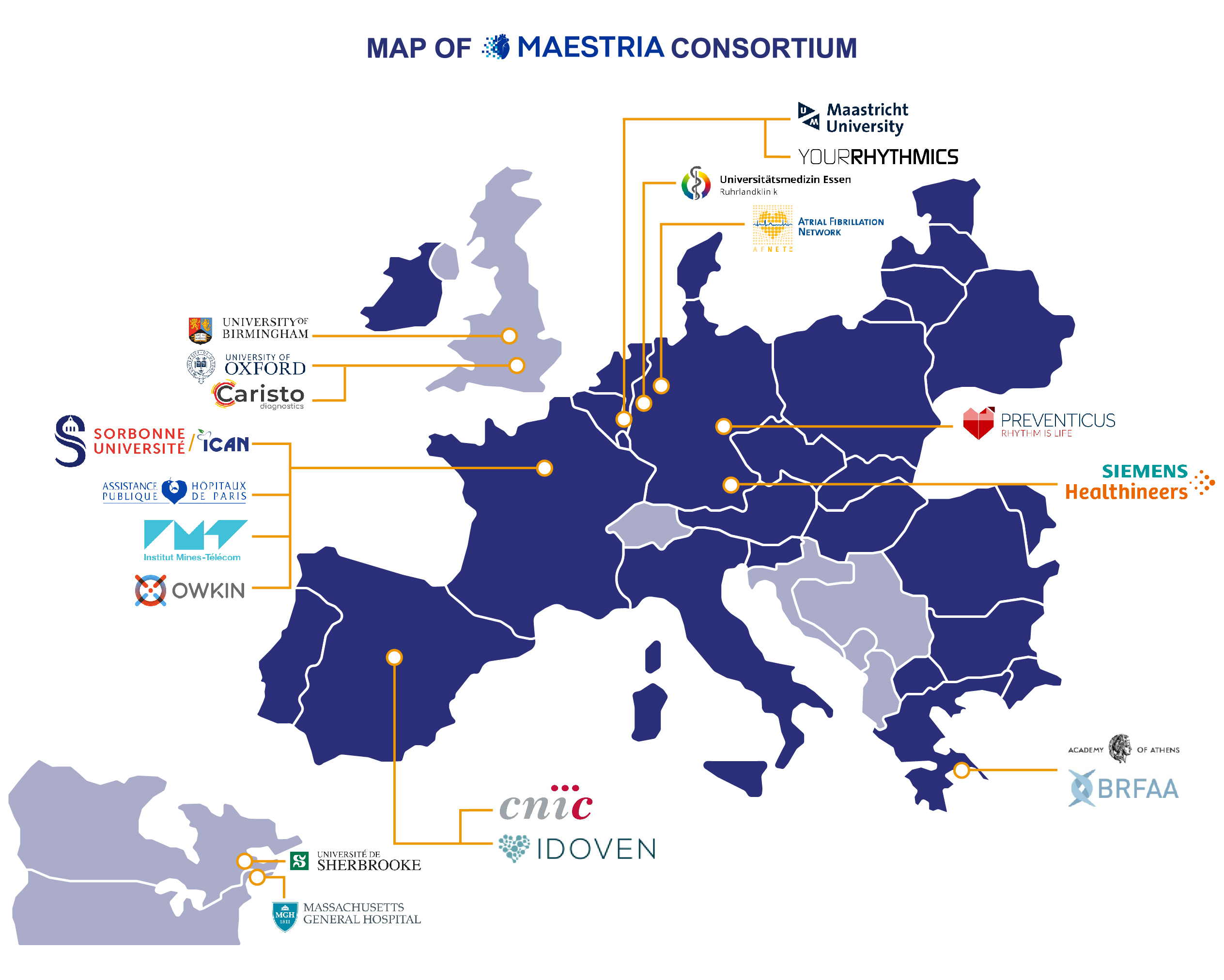 The MAESTRIA consortium consists of 18 partners: 12 academic institutions with a strong focus on clinical data integration and artificial intelligence research, 5 biotech companies (SMEs) and 1 large imaging company. The consortium benefits from the close integration of academic partners and industry partners with their joint involvement in all the work packages characterised by a collaborative bidirectional sharing of expertise and data. MAESTRIA is coordinated by Prof S. HATEM a clinician-scientist with substantial experience delivering successful multi-centre collaborative research projects (FP7 EUTRAF and H2020 CATCH-ME), former coordinator of a Leduc Foundation transatlantic network of Excellence on Atrial Fibrillation and executive director of SU-ICAN, a translational research excellence centre.
